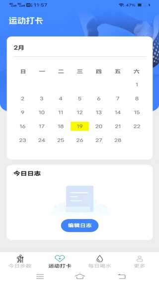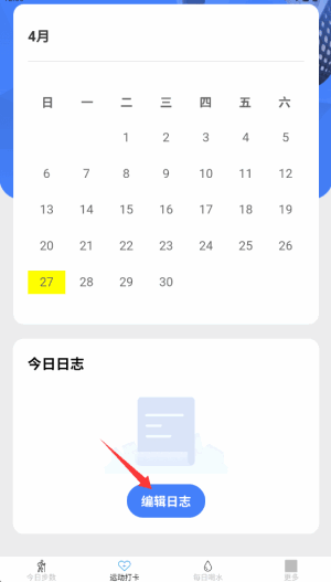 2、进入运动打卡模块,用户每天都能在这里打卡,还能编辑日志。