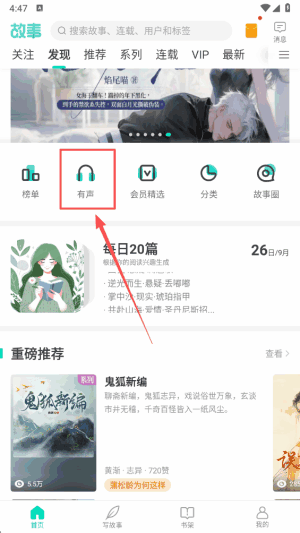 2、选择“有声”选项,进入小说音频专区,寻找您感兴趣(interested)的内容(rong)。