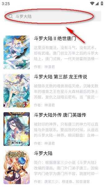 接着搜索(search)要看的漫画,比如斗罗大陆,下面就会出现相关作品;