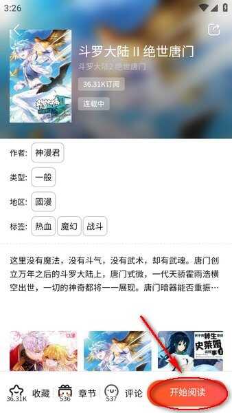 选择要观看的漫画,就会进入详情界面,点击右下角的“开始阅读”;