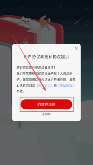 1、点击“同意”按钮,顺利进入应用界面,开始您的小说探索之旅。