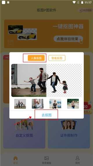 2、然后选择人像抠图,点击去抠图,再选择一张图片;