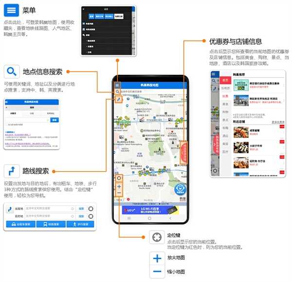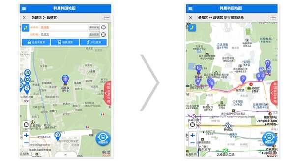 1、地铁公交查询,提供中韩对照版的路线图,根据起点和重点为你推荐乘坐路线;