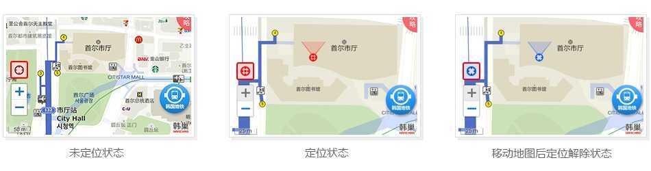当“定位键”处于红色图标时表示定位功能启动,此时只可放大、缩小地图,如若移动地图的话,“定位键”会变成蓝色,自动解除定位功能。想要再次定位,只需再次点击“定位键”即可。