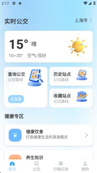 1.首页支持实时公交查询、历史站点回顾及收藏站点管理,同时提供健康出行相关资讯。