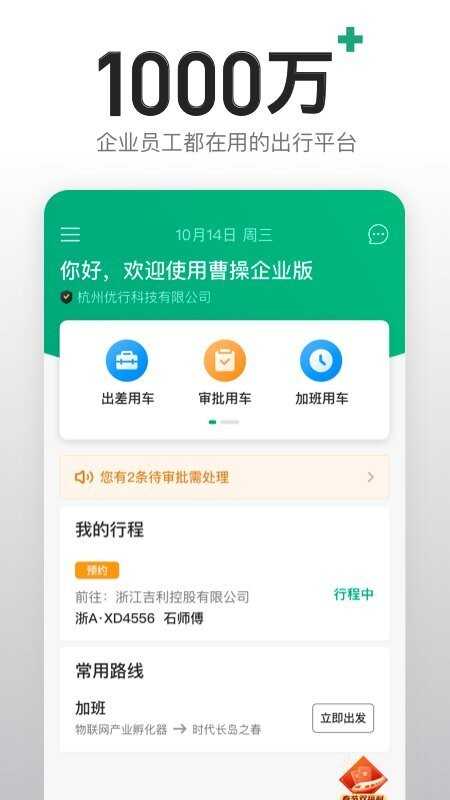 专业的企业用车服务应用,曹操企业版app是支持出差用车、审批用车、加班用车、行程管理等功能,绿色公务出行高效便捷。