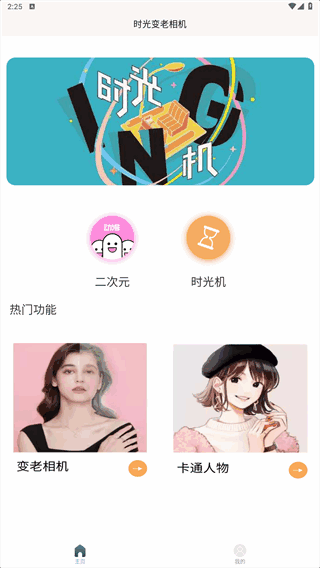 2、软件首页提供二次元、时光机、变老相机、卡通人物等拍摄(paishe)功能(neng)。