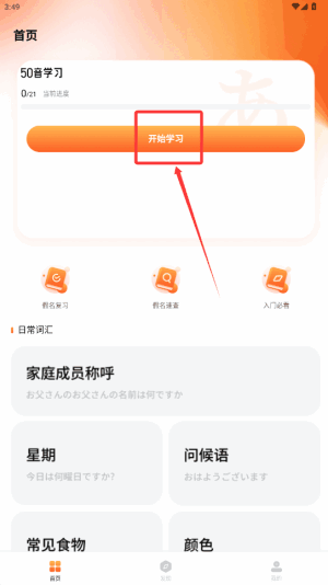 1、首页找到50音学习板块,开始学习按钮进入课程。
