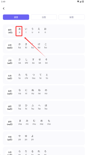 2、在五十音图表中点选清音按钮,找到あ行假名,点击开始学习。