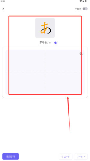4、在书写练习界面,观察あ字笔顺,跟练书写。