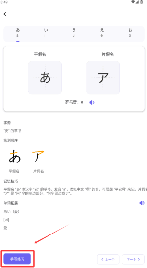 3、进入详情页后,查看平假名あ和片假名ア的写法,点击手写练习。
