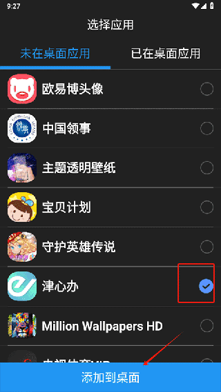 3、将所要添加到桌面的应用勾选,并点击下方的【添加到桌面】;