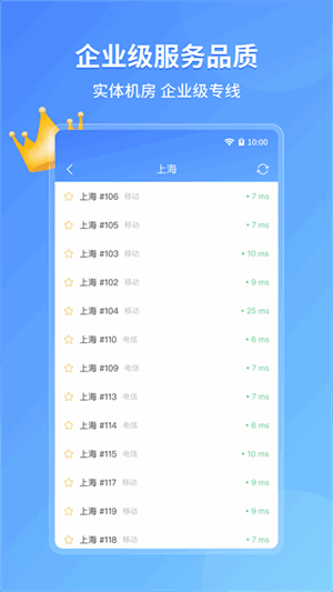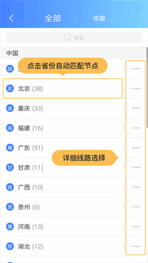 2、点击服(fu)务器按钮,进入服(fu)务器列表,支持【自动匹配节点】功能,点击所需省份即可为您自动选择合适的服(fu)务器