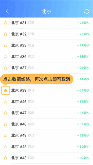 4、服(fu)务器列表分为“全部”和“收藏”,点击服(fu)务器前端“星标”即可收藏线路,再次点击即可取消收藏,收藏的线路保存在收藏