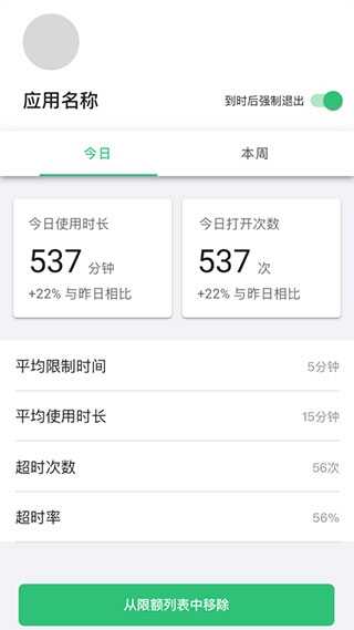 4、选择应用就可以查看统计的用起来时长和打开次数,包括平均限制时间、超时次数等;