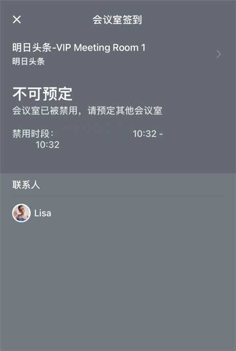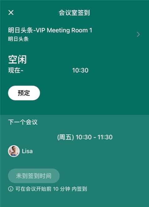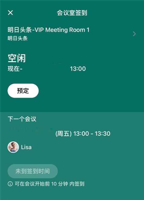 如果该会议室由于禁用、预定时间限制、预定范围限制等原因,在当前时间无法预定,签到(dao)页面将显示为灰色,成员可点(dian)击查看会议室空闲情况,查找空闲时段进行预定,或选择预定其(qi)他(ta)会议室。