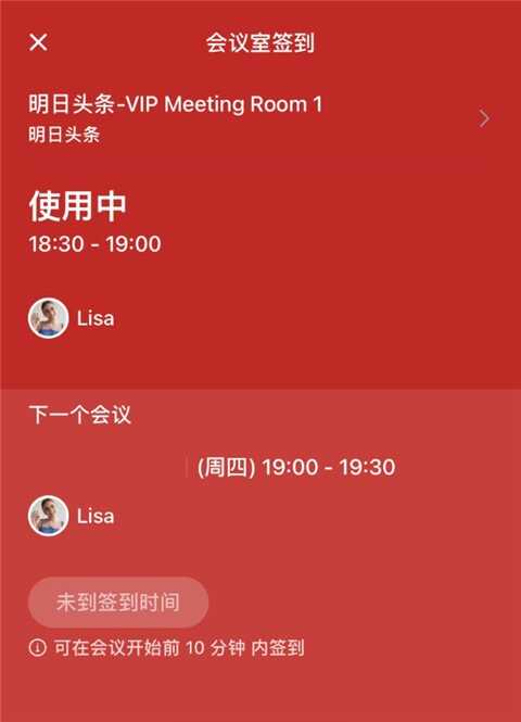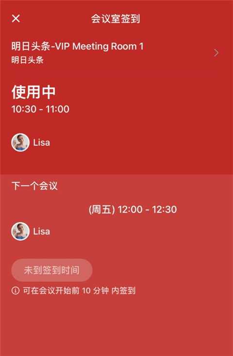 签到(dao)成功后,成员便可在预定时间内使用该会议室,此段时间内,签到(dao)页面将显示为红色,并提示会议室在使用中。