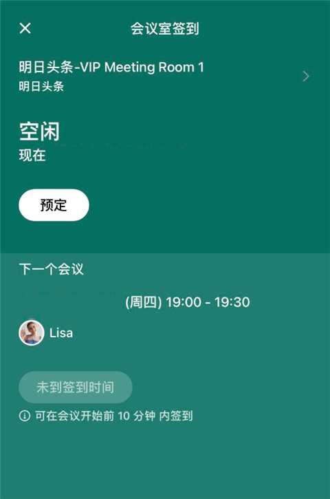 如果该会议室正处于空闲状态,签到(dao)页面将显示为绿色,可以(yi)点(dian)击预定即时预定会议室。