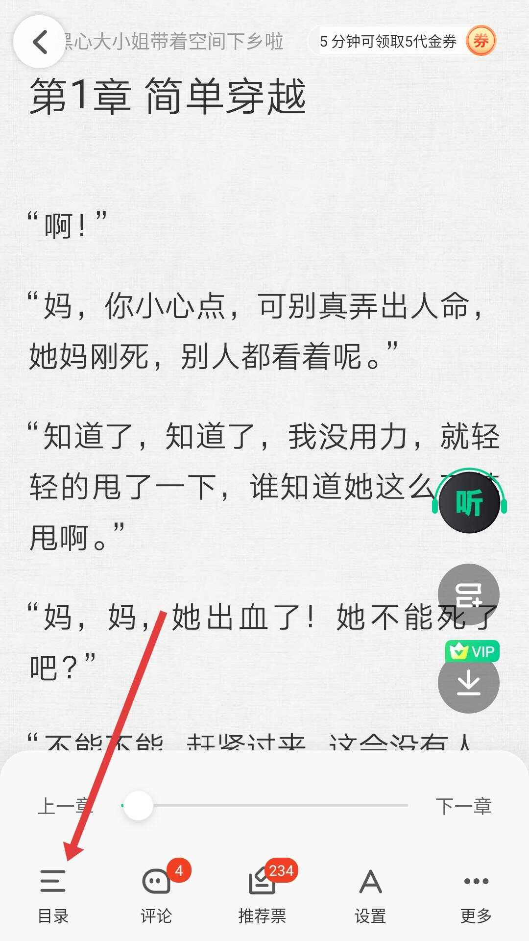 2、点击屏幕找到左下方的目录选项,点击目录,展开章节列表,可快速跳转至想看的章节,继续阅读。