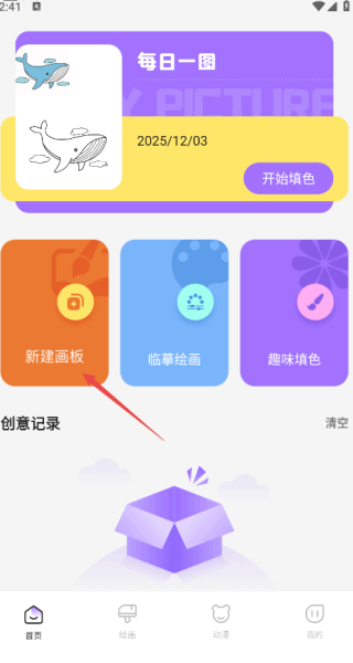 1、大家在安装进入app之后,我们能够看到核心绘画功能(Function),点击(click)创建画板;