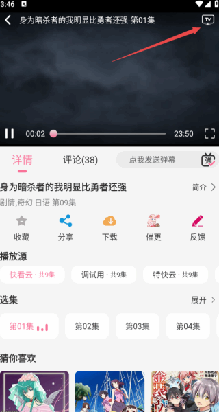 2、点击进入到播放界面,点击播放窗口,呼出功能菜单,点击右上角的投屏;