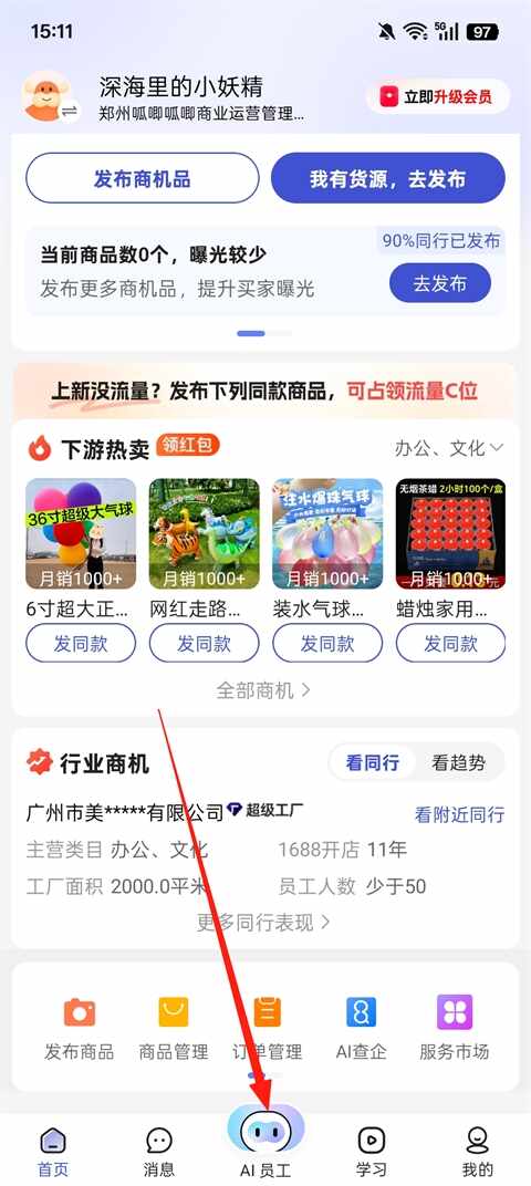 1、打開1688商家版App,登录之後,点击(dianji)【AI员工】