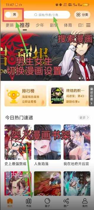2、进入主页,可以在上方切换男漫女漫和搜索漫画,也可以点击下方第二个菜单栏将喜欢的漫画加入(jiaru)书架;