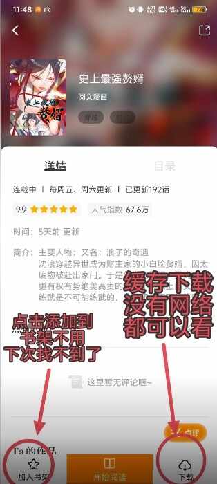 5、进入漫画详情页,还可以收藏加入(jiaru)书架和离线缓存。