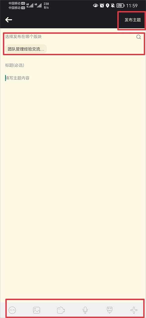 2、然后在编辑界面中搜索你要发布内容所属的版块,选择完成(wancheng)后将发布内容、标题等编辑完成(wancheng)后点击右上角发布主题即可,用户(user)若要在内容中添加图片、视频、表情包等可以在下方菜单栏目中进行添加