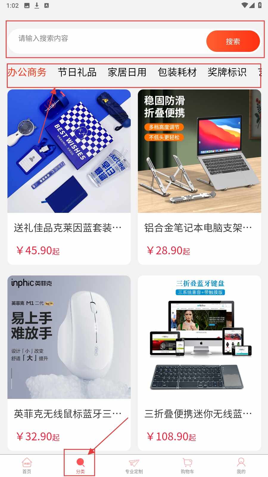 1、在【首页】,有搜索栏(支持来样定制)、“办公商务”等5大分类、“企业定制”商品、“场景化采购”板块,点击分类/商品进入对应页面。