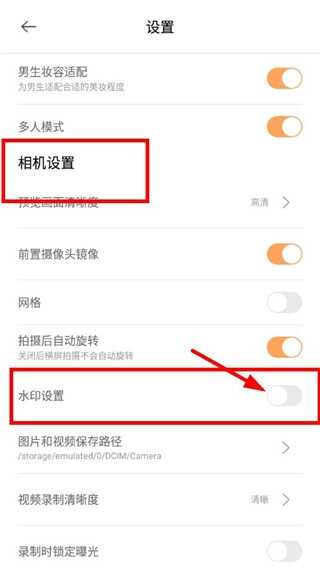 4、再在【相机设置】栏将【水印设置】右侧的开关,关闭即可