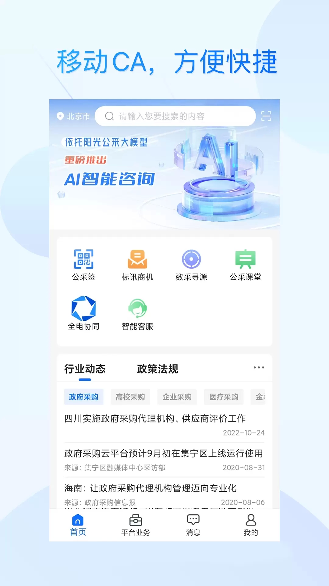 3、政府采购(purchase)一站式入口(rukou),CA办理、签章、加密全流程线(xian)上(shang)秒办。