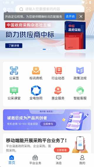 1、下载最新版公采易通app,看到温馨提示的弹窗直接点同意。