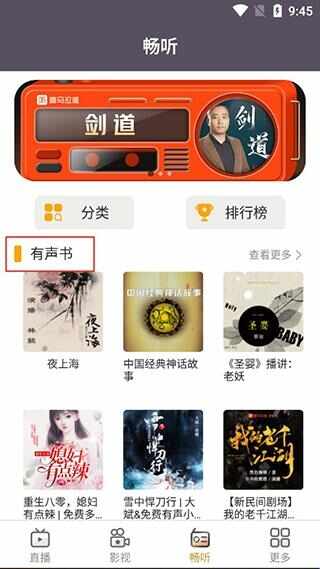 3、除了(chuliao)可以(yi)看到电视,大家可以(yi)听有声书,例如言情小说重生八零媳妇有点辣、雪中悍刀行等。