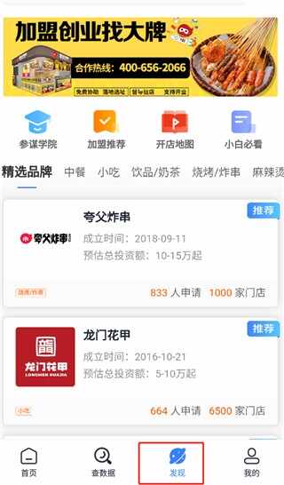 3、点击发现,用户可以在里面看到很多加盟连锁店;