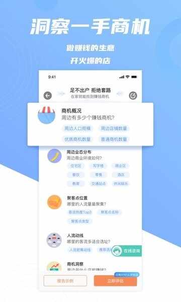 3、为开店创业者、线下实体经营者提供周边调研、洞察商圈、客群定位、竞争评估、加盟分析、行业报告等服务,让你一眼透析周边人口规模、商圈客群、竞争环境、人流聚客点、交通便利性及未来市政规划。