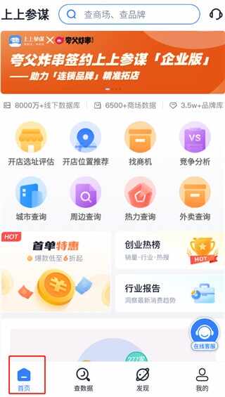 1、打开在本站下载的上上参谋app,点击软件进入首页,我们可以看到由非常多的功能,如开店选址评估、开店位置推荐、城市查询、周边查询等等;