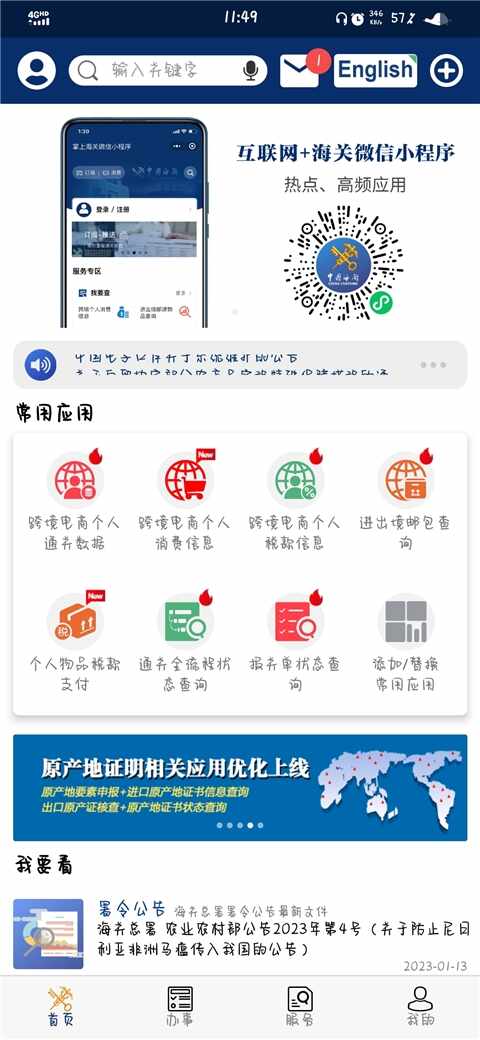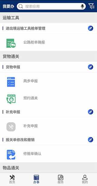 2、【办事】页面为用户(yonghu)提供了各种各样的事项办理业务,例(li)如运输工具类、货物通关类、物品通关类等。