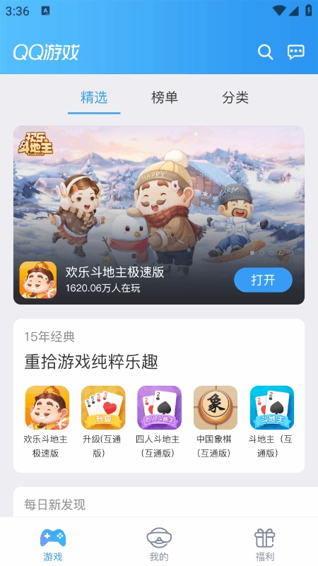 2、经典升级,焕新体验:经典游戏欢乐斗地主、欢乐麻将、连连看、QQ游戏斗地主等,现已全面升级,保留经典玩法的同时,融入创新设计,画面更加精美。