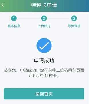 7、填写无误,界面显示“申请成功”。回到首页,在最下方点击进入“扫码乘车”,即可正(zheng)常使用。