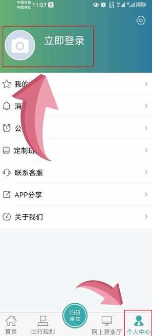 1、打开长治公交通APP,点击右下角“个人中(zhong)心(xin)”,进入登录界面,点击“立即登录”;