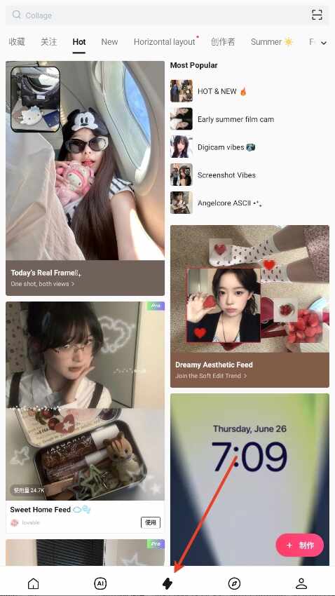 6、在主页面中间栏的創莋按钮,可进入灵感专区,大家可以在这里找到拍照、p图攻略、灵感。