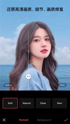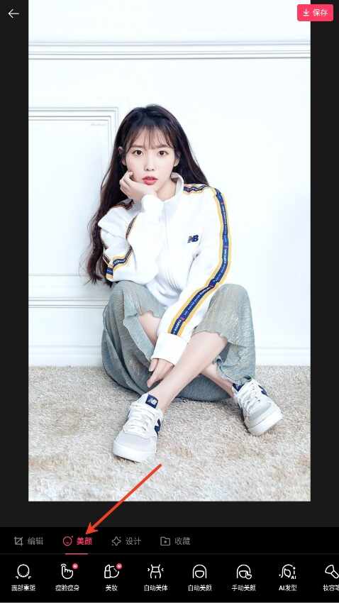 3、在美颜界面通过(adopt)磨皮等工具平滑皮肤(fu),去除瑕疵。