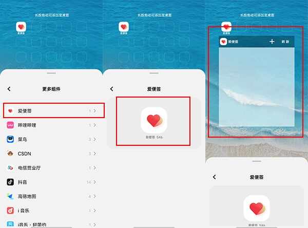 2、滑动找到爱便签,点击或者长按拖动到桌面就添(tian)加(jia)成功啦
