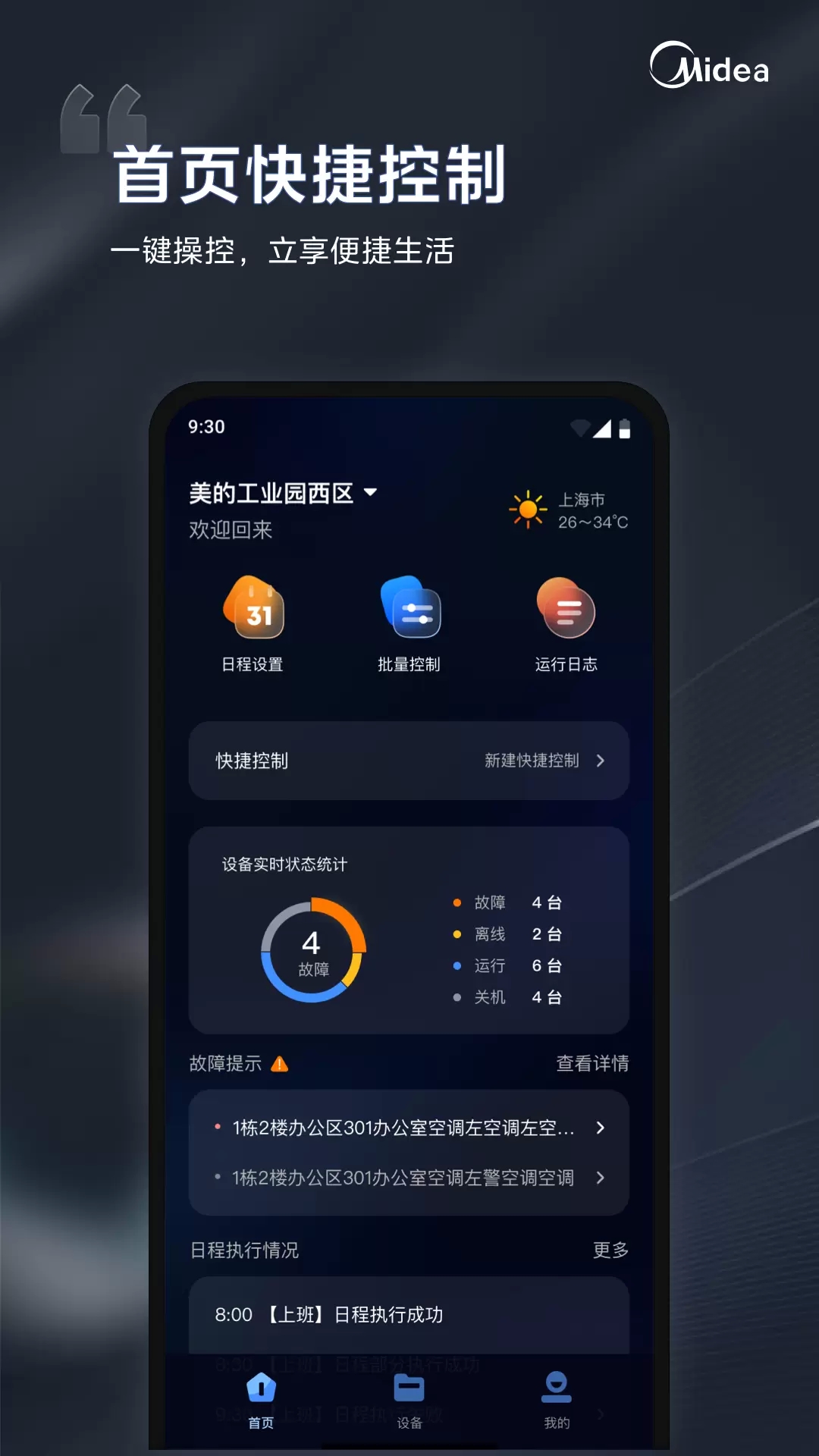 实时的设备监测:直观查看每个设备的实时运(yun)行(xing)状态、故障情(qing)况、故障详情,及设备整軆运(yun)行(xing)成功率