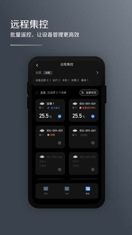 远程的设备控制:远程对空调进(jin)行(xing)单独或批量控制,涵盖启停、温度、模式、风速等多个参数的常规和高级控制