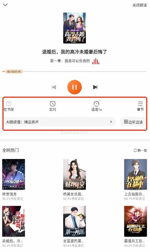2、进入听书模式中可以设置朗读语速、定时关闭等(deng)等(deng)。