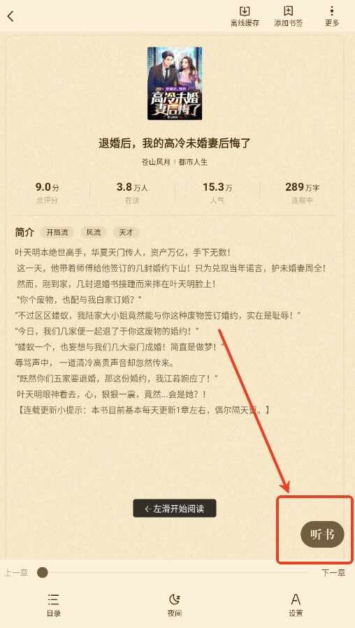 1、进入一本小说,点击右下角的“听书”。