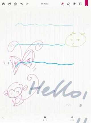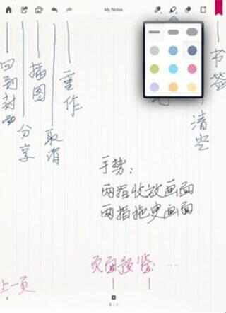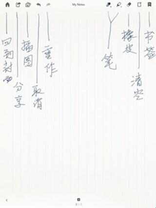 1、双击笔记可以新建一个空白页,对应上图的注释,上方功能列表从左至右分别为:返回封面、分享、上一步与下一步、画笔、马克笔、橡皮擦、清除整页以及设置标签。