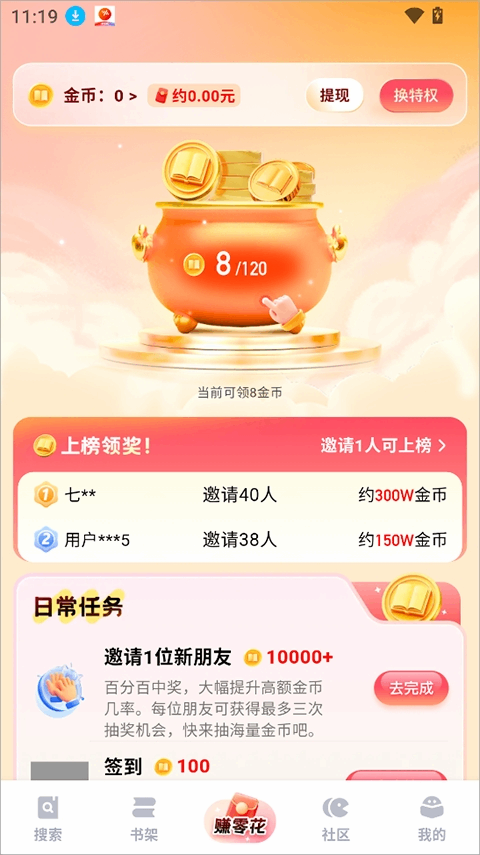 3、app中可以通过签到、完成任务等方式赚取金币,金币可提(ti)现(xian)当零花钱